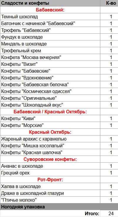 Темный шоколад (1 шт), Батончик с начинкой "Бабаевский" (1 шт), Трюфель "Бабаевский" (1 шт), Фундук в шоколаде (1 шт), Миндаль в шоколаде (1 шт), Трюфельный крем (1 шт), Жареный арахис с карамелью (1 шт), Ананас в шоколаде (1 шт), Грецкий орех (1 шт), Халва в шоколаде (1 шт), Драже в шоколадной глазури (1 шт), "Птичье молоко" (1 шт)