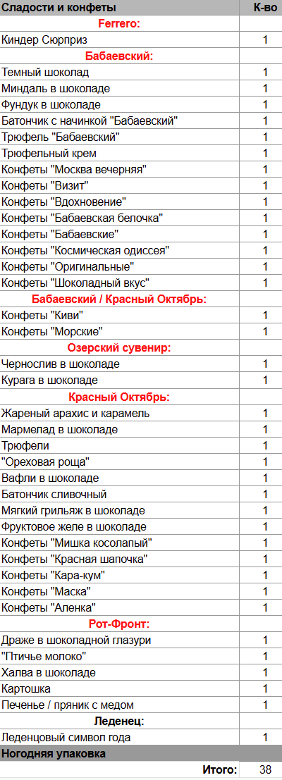 Киндер Сюрприз (1 шт), Темный шоколад (1 шт), Миндаль в шоколаде (1 шт), Фундук в шоколаде (1 шт), Батончик с начинкой "Бабаевский" (1 шт), Трюфель "Бабаевский" (1 шт), Трюфельный крем (1 шт), Чернослив в шоколаде (1 шт), Курага в шоколаде (1 шт), Жареный арахис и карамель (1 шт), Мармелад в шоколаде (1 шт), Трюфели (1 шт), "Ореховая роща" (1 шт), Вафли в шоколаде (1 шт), Батончик сливочный (1 шт), Мягкий грильяж в шоколаде (1 шт), Фруктовое желе в шоколаде (1 шт), Драже в шоколадной глазури (1 шт), "Птичье молоко" (1 шт), Халва в шоколаде (1 шт), Картошка (1 шт), Печенье / пряник с медом (1 шт), Леденцовый символ года (1 шт)