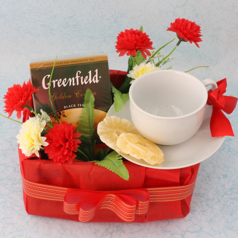Состав: цветы 2шт,чашка, чай Гринфилд ,сухофрукты, открытка