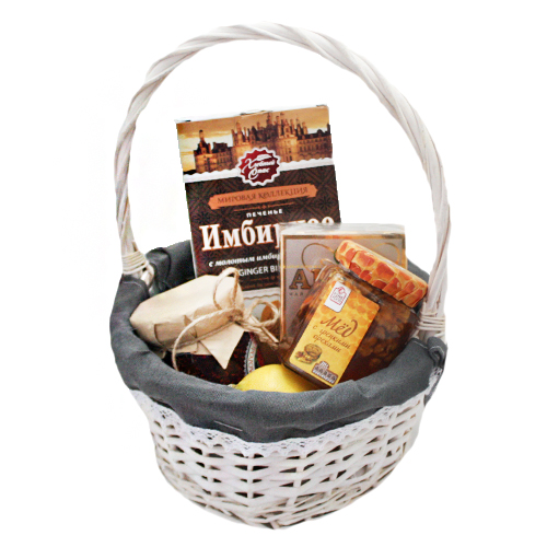 Состав : Корзина, печенье имбирное, варенье малиновое, лимон, мед, чай