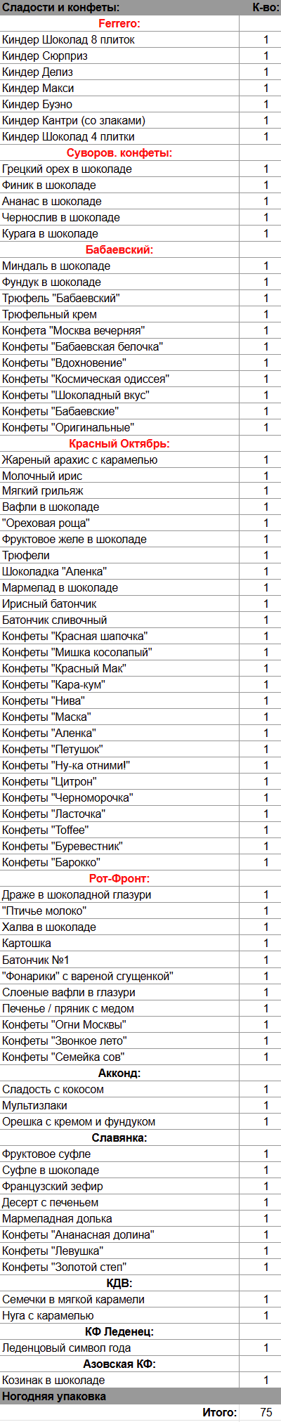 Киндер Шоколад 8 плиток (1 шт), Киндер Сюрприз (1 шт), Киндер Делиз (1 шт), Киндер Макси (1 шт) , Киндер Буэно (1 шт), Киндер Кантри (со злаками) (1 шт), Киндер Шоколад 4 плитки (1 шт) , Грецкий орех в шоколаде (1 шт), Финик в шоколаде (1 шт), Ананас в шоколаде (1 шт), Чернослив в шоколаде (1 шт), Курага в шоколаде (1 шт), Миндаль в шоколаде (1 шт), Фундук в шоколаде (1 шт), Трюфель "Бабаевский" (1 шт), Трюфельный крем (1 шт), Жареный арахис с карамелью (1 шт), Молочный ирис (1 шт), Мягкий грильяж (1 шт), Вафли в шоколаде (1 шт), "Ореховая роща" (1 шт), Фруктовое желе в шоколаде (1 шт), Трюфели (1 шт), Шоколадка "Аленка" (1 шт), Мармелад в шоколаде (1 шт), Ирисный батончик (1 шт), Батончик сливочный (1 шт), Драже в шоколадной глазури (1 шт), "Птичье молоко" (1 шт), Халва в шоколаде (1 шт), Картошка (1 шт), Батончик №1 (1 шт), "Фонарики" с вареной сгущенкой" (1 шт) , Слоеные вафли в глазури (1 шт), Печенье / пряник с медом (1 шт, Сладость с кокосом (1 шт) , Мультизлаки (1 шт), Орешка с кремом и фундуком (1 шт), Фруктовое суфле (1 шт), Суфле в шоколаде (1 шт), Французский зефир (1 шт), Десерт с печеньем (1 шт), Мармеладная долька (1 шт), Семечки в мягкой карамели (1 шт), Нуга с карамелью (1 шт), Леденцовый символ года (1 шт), Козинак в шоколаде (1 шт)