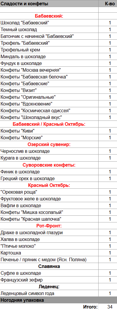 Шоколад "Бабаевский" (1 шт), Темный шоколад (1 шт), Батончик с начинкой "Бабаевский" (1 шт), Трюфель "Бабаевский" (1 шт), Трюфельный крем (1 шт), Миндаль в шоколаде (1 шт), Фундук в шоколаде (1 шт), Чернослив в шоколаде (1 шт), Курага в шоколаде (1 шт), Финик в шоколаде (1 шт), Грецкий орех в шоколаде (1 шт), "Ореховая роща" (1 шт), Фруктовое желе в шоколаде (1 шт), Вафли в шоколаде (1 шт), Драже в шоколадной глазури (1 шт), Халва в шоколаде (1 шт), "Птичье молоко" (1 шт), Картошка (1 шт), Печенье / пряник с медом (1 шт), Суфле в шоколаде (1 шт), Французский зефир (1 шт), Леденцовый символ года (1 шт)