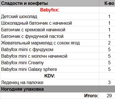 Детский шоколад (1 шт), Шоколадный батончик с начинкой (1 шт), Батончик с кремовой начинкой (1 шт), Батончик с фундучной пастой (1 шт), Жевательный мармелад с соком ягод (2 шт), Babyfox miini c фундуком (5 шт), Babyfox mini с молочной начинкой (5 шт), Babyfox mini Creamy (5 шт), Babyfox mini Galaxy sphere (5 шт), Леденец на палочке (3 шт)