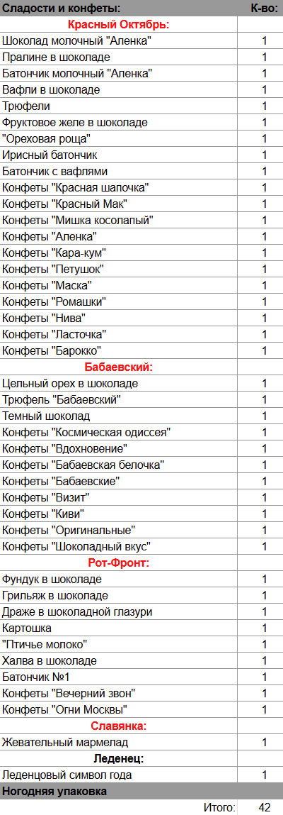 Шоколад молочный "Аленка" (1 шт), Цельный орех в шоколаде (1 шт), Трюфель "Бабаевский" (1 шт), Темный шоколад (1 шт), Пралине в шоколаде (1 шт), Батончик молочный "Аленка" (1 шт), Вафли в шоколаде (1 шт), Трюфели (1 шт), Фруктовое желе в шоколаде (1 шт), "Ореховая роща" (1 шт), Ирисный батончик (1 шт), Батончик с вафлями (1 шт), Фундук в шоколаде (1 шт), Грильяж в шоколаде (1 шт), Драже в шоколадной глазури (1 шт), Картошка (1 шт), "Птичье молоко" (1 шт), Халва в шоколаде (1 шт), Батончик №1 (1 шт), Жевательный мармелад (1 шт), Леденцовый символ года (1 шт)
